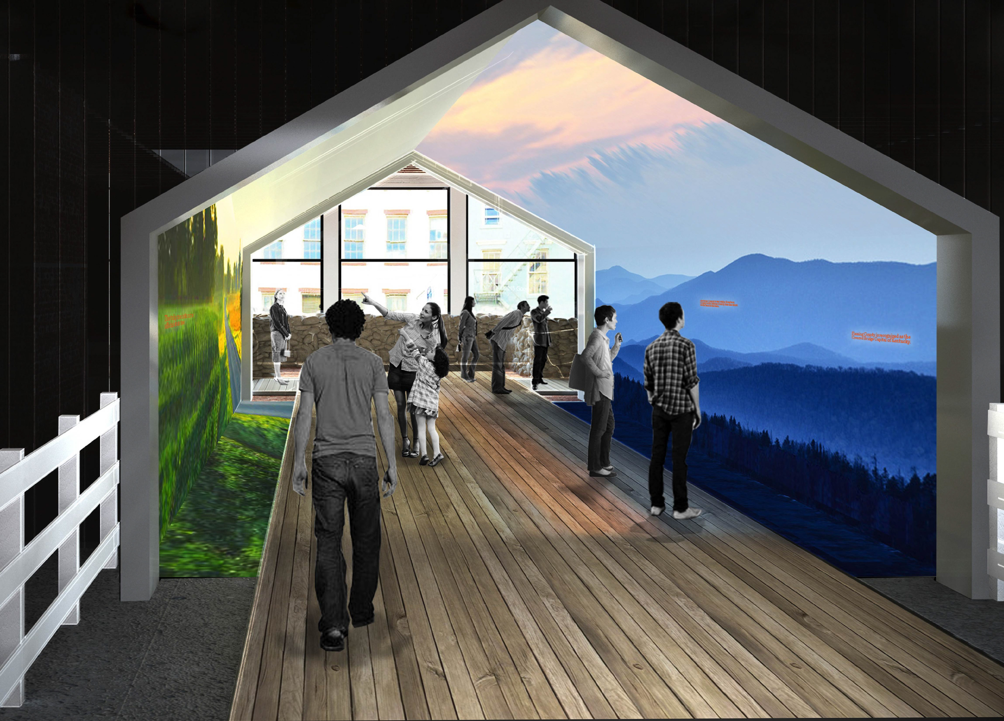 The formal entrance to the Bourbon History Experience is an embodiment of the Spirit of Kentucky. The design is inspired by the iconic elements of the Kentucky region and the genuine, welcoming character of the bourbon distilleries that call Kentucky home. The threshold into the experience forms the profile of a barn, complete with its recognizable gable. Projected onto the walls and ceiling of the bridge is a video showing the hidden beauty that is Kentucky. I created the video and audio to appear seamless as if the viewer is watching a movie. In order to show various aspects of Kentucky at the same time, there are 2 separate videos that play simultaneously, immersing the viewer into Kentucky.