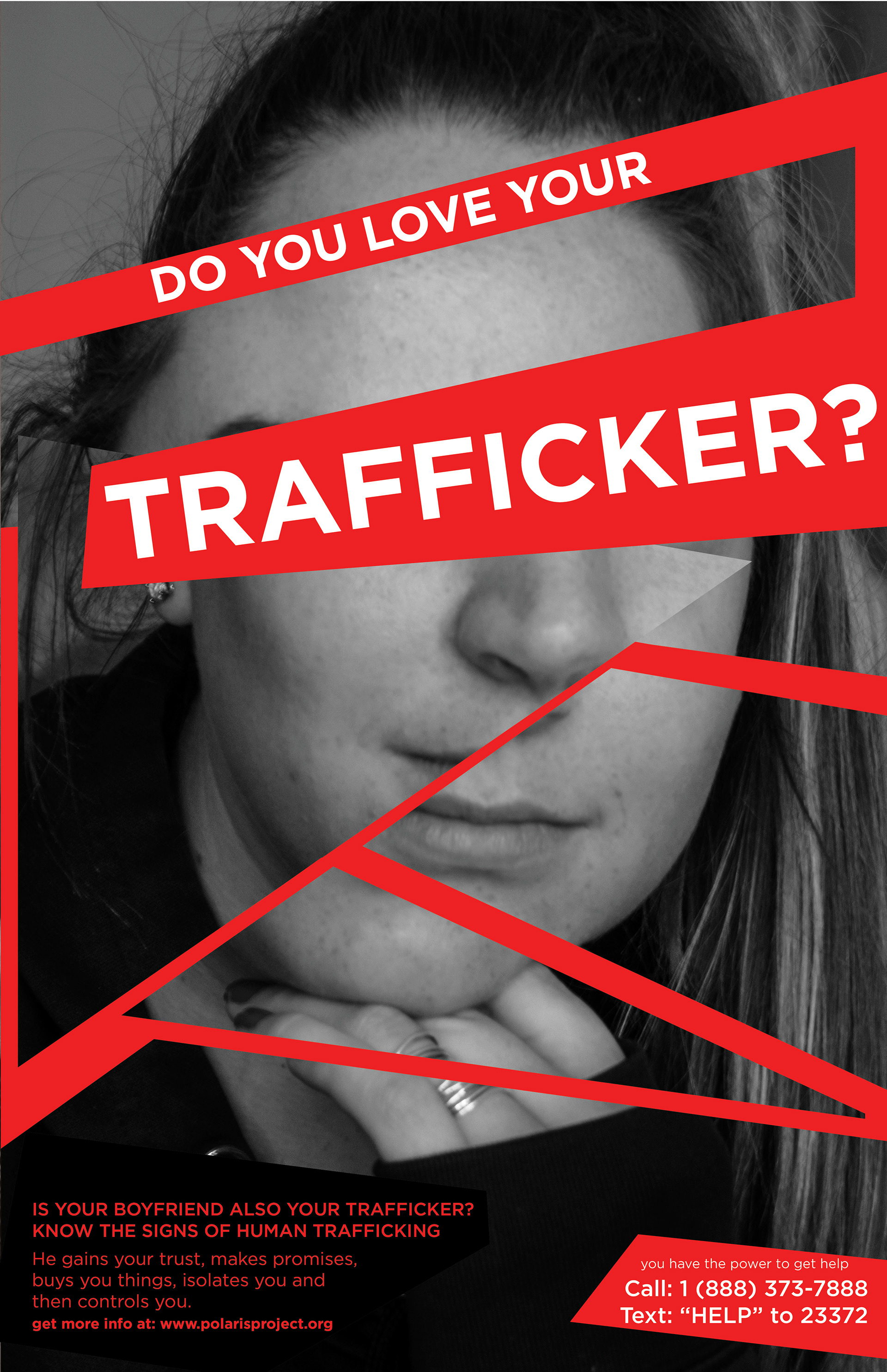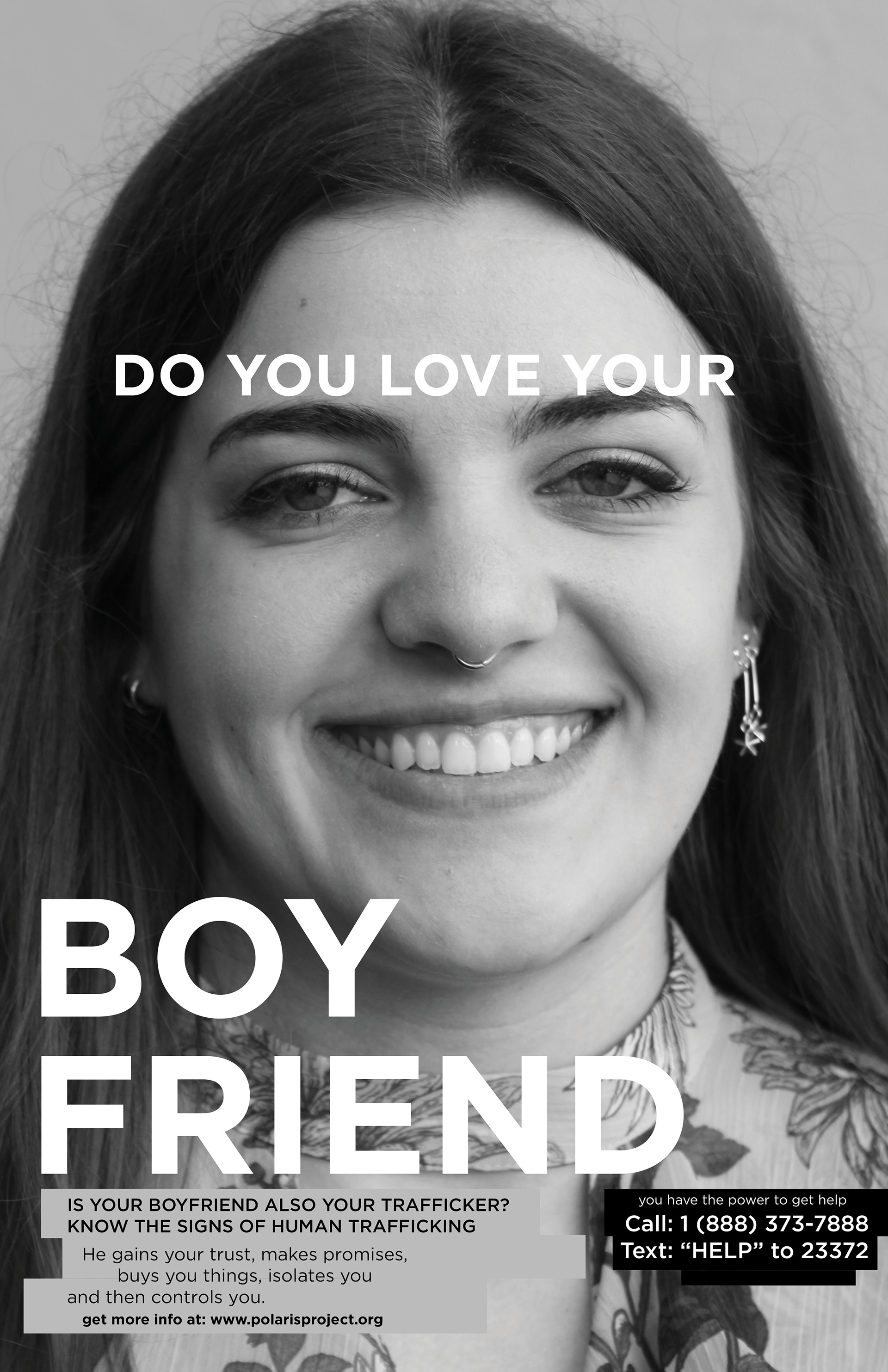 For my Senior B.F.A. thesis, I researched the Sex Trafficking industry. Women ages 11-19 who grew up in lower socio-economic neighborhoods or were sexually abused growing up are the most at risk of falling victim. These women are most susceptible to coercion through the means of a loverboy or Romeo pimp. These particular pimps prey on vulnerable women by maintaining a facade of romantic attraction to ultimately force them into sex work. My goal of this project was to show these women that this man in their life, may not be who they think. I wanted to design a series of posters that will hang in places that these girls go, such as gas station bathrooms and truck stops. I decided to make these posters lenticular as they convey the duality of becoming a prostitute.